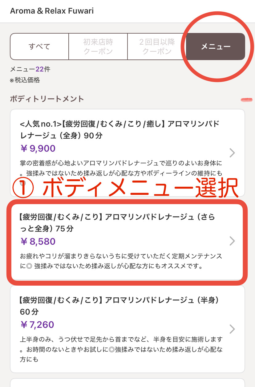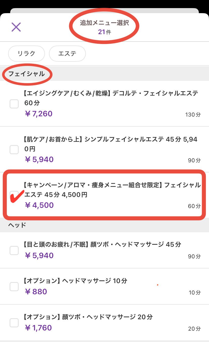 →追加で、フェイシャルの一番下のキャンペーンメニューをお選びください。